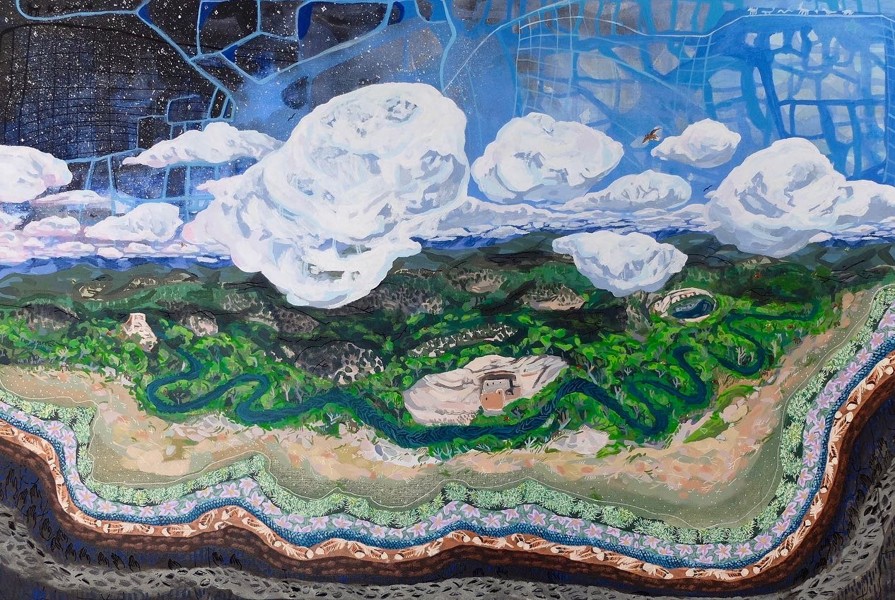 This painting combines observational painting with an imaginative bird's eye view of the Verde Valley. Montezuma Well, Montezuma Castle, and Tuzigoot are all connected by Beaver Creek, which brings vibrant life to the valley. Local flora and fauna are painted in the sky and throughout the valley to emphasize how dependent their life cycles are on natural resources, including the night sky. Light pollution negatively affects the processes of nocturnal animals among other things (a link to a NPS article on light pollution and other natural resources is linked below). The five layers at the bottom of the canvas represent the five geological layers of the valley where the three monuments are located: Precambrian metamorphic and igneous, Tepeats Sandstone, Martin Limestone, Red Wall Limestone, and Verde Limestone. The patterns within these layers represent (from top to bottom) the prickly pear, silver-leafed nightshade, western fence lizard, red-tailed hawk, and harvest ant. Below the five layers, the outline of hands, raindrops, and the pattern from a decaying cactus represent the main threat to this ecosystem: water usage and land development.